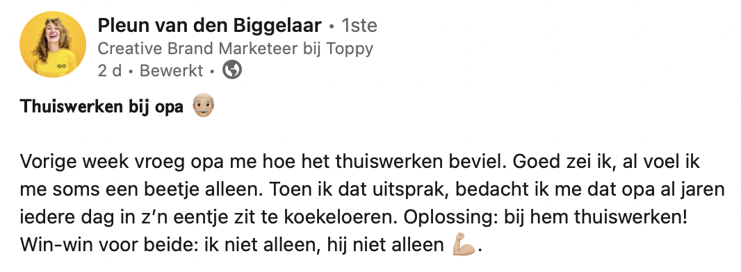 Pleun vindt het thuiswerken eenzaam, maar daar bedenkt haar opa iets op