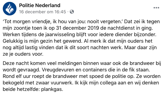 1. Politie Nederland deelt dit verhaal op Facebook, geschreven door brigadier Robin. Hij draait een nachtdienst tijdens de jaarwisseling. Het regent meldingen.