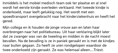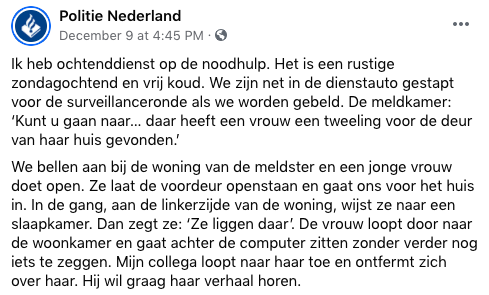 1. Politie Nederland deelt het ingrijpende verhaal op Facebook. Samen met een collega gaat hoofdagent Emile naar de woning van de jonge vrouw. De baby’s bevinden zich in haar woning.
