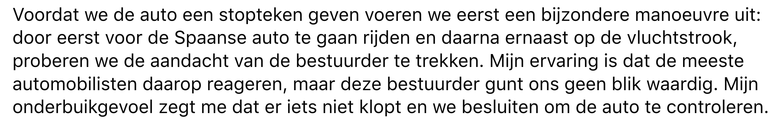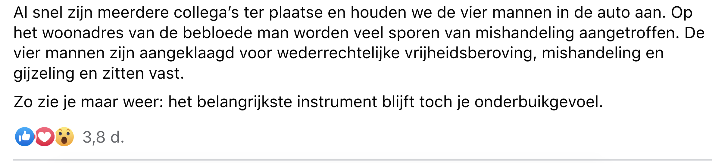 Politieagenten moeten vaak snel schakelen, en daar hoort een goed inschattingsvermogen bij. Tijdens een avonddienst op de snelweg valt het twee agenten op dat sommige passagiers in een andere auto zich enigszins bijzonder gedragen. Op zo’n moment moet er een keuze worden gemaakt: je onderbuikgevoel volgen en de auto een stopteken geven, of de auto door laten rijden. Hoofdagent Jan deelt het voorval op Facebook.