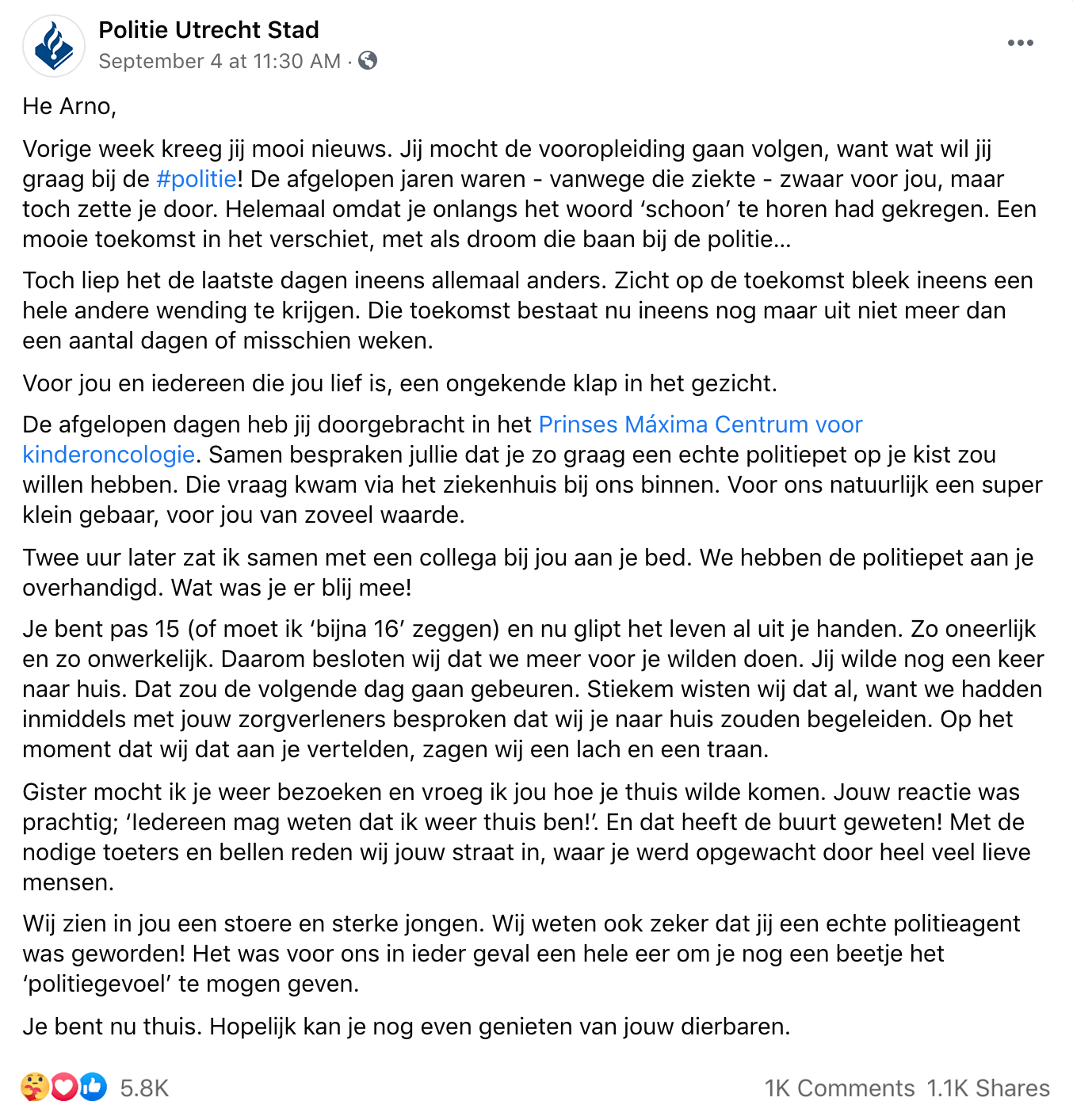 1. De politie Utrecht deelde het ontroerende bericht op Facebook.