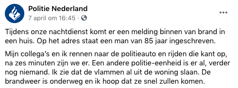 1. Dit is het bericht dat Politie Nederland op Facebook plaatste. Nadat zij na de melding bij de woning aankwamen, sloegen de vlammen al uit de woning.