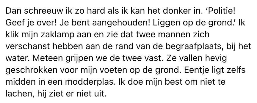 Wanneer de politie op zoek is naar ontsnapte inbrekers, komen ze op een bijzondere plek terecht. De mannen zijn namelijk in het donker naar een begraafplaats gevlucht. Niet de meest fijne plek om ’s avonds op onderzoek uit te gaan, zelfs niet voor politieagenten. Gelukkig krijgen ze de inbrekers snel te pakken, al is de manier waarop aardig dubieus…