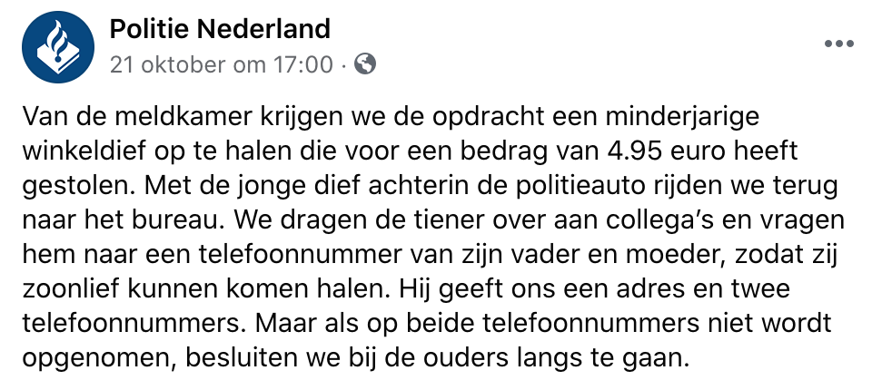 1. De agenten krijgen een melding van diefstal van een minderjarige. Zij moeten zijn ouders hierover inlichten.