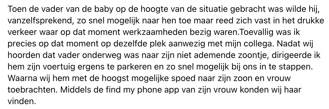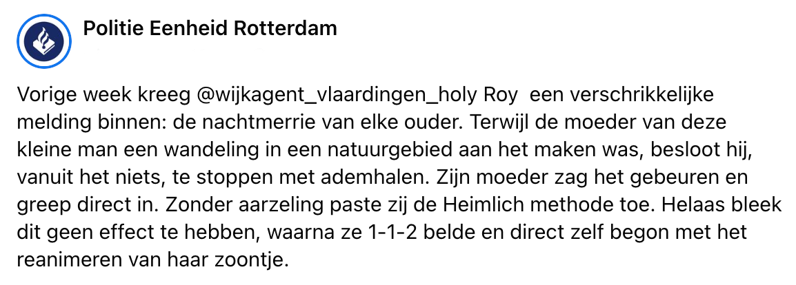 Politieagenten doen veel meer dan achter boeven aanrennen en parkeerboetes uitdelen; ze zijn er namelijk ook voor iedereens veiligheid. Vorige week kreeg politieagent Roy een schokkende melding binnen: een moeder was aan het wandelen met haar baby toen het kind stopte met ademhalen. Roy kwam meteen in actie. Hoewel de moeder van het kind al was begonnen met reanimeren, kon Roy met zijn collega gelukkig op een andere manier helpen.