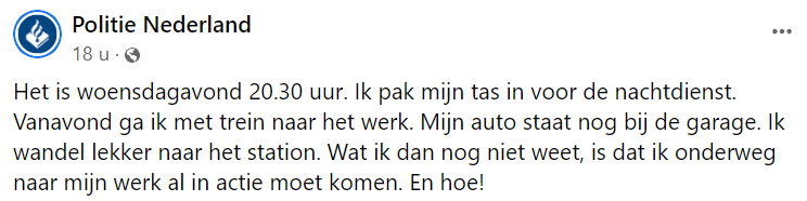 Politie Nederland deelt op Facebook een opmerkelijk verhaal. Politieagent Jelle begint zijn avond zoals hij altijd doet. Maar zodra hij onderweg is, gaat zijn dienst al van start. Ook al is hij nog niet in uniform.