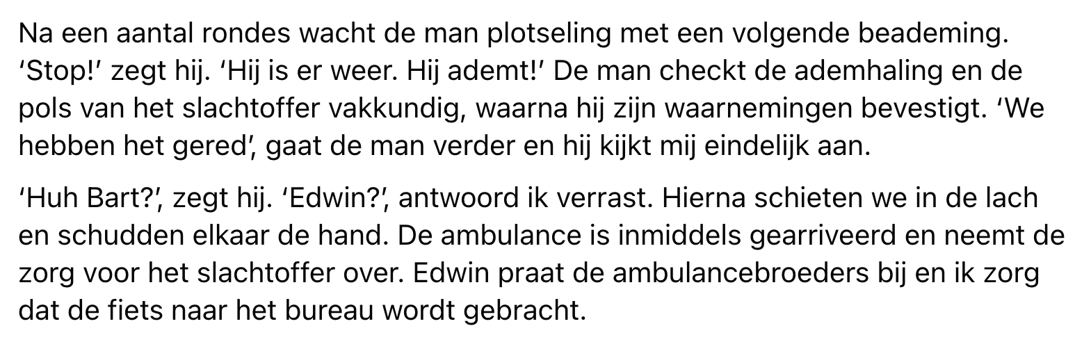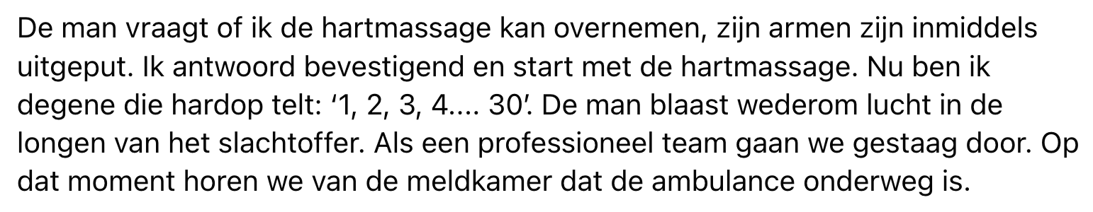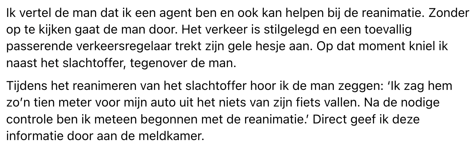 1. Wanneer politieagent Bart op de plek van een ongeval aankomt, wordt het slachtoffer al gereanimeerd.