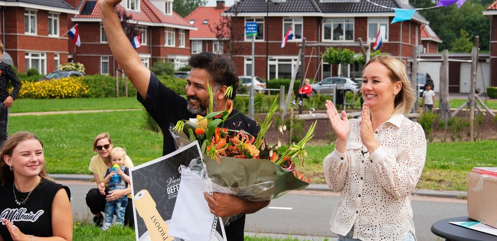 De hele buurt was uitgelopen voor de verrassing. Allemaal vinden ze hem leuk. “Hij is altijd beleefd en lacht. Wat ook erg fijn is, is dat hij nooit haast heeft. Hij laat je echt als een ‘mens’ voelen in plaats van gewoon een persoon op zijn route. Door iets vriendelijks te zeggen of even te zwaaien als hij langsrijdt. Ali is echt een voorbeeld van hoe het wél moet.” En daarom verrasten ze hem met bloemen, een shirt en een grote kaart gevuld met keiharde flappen.