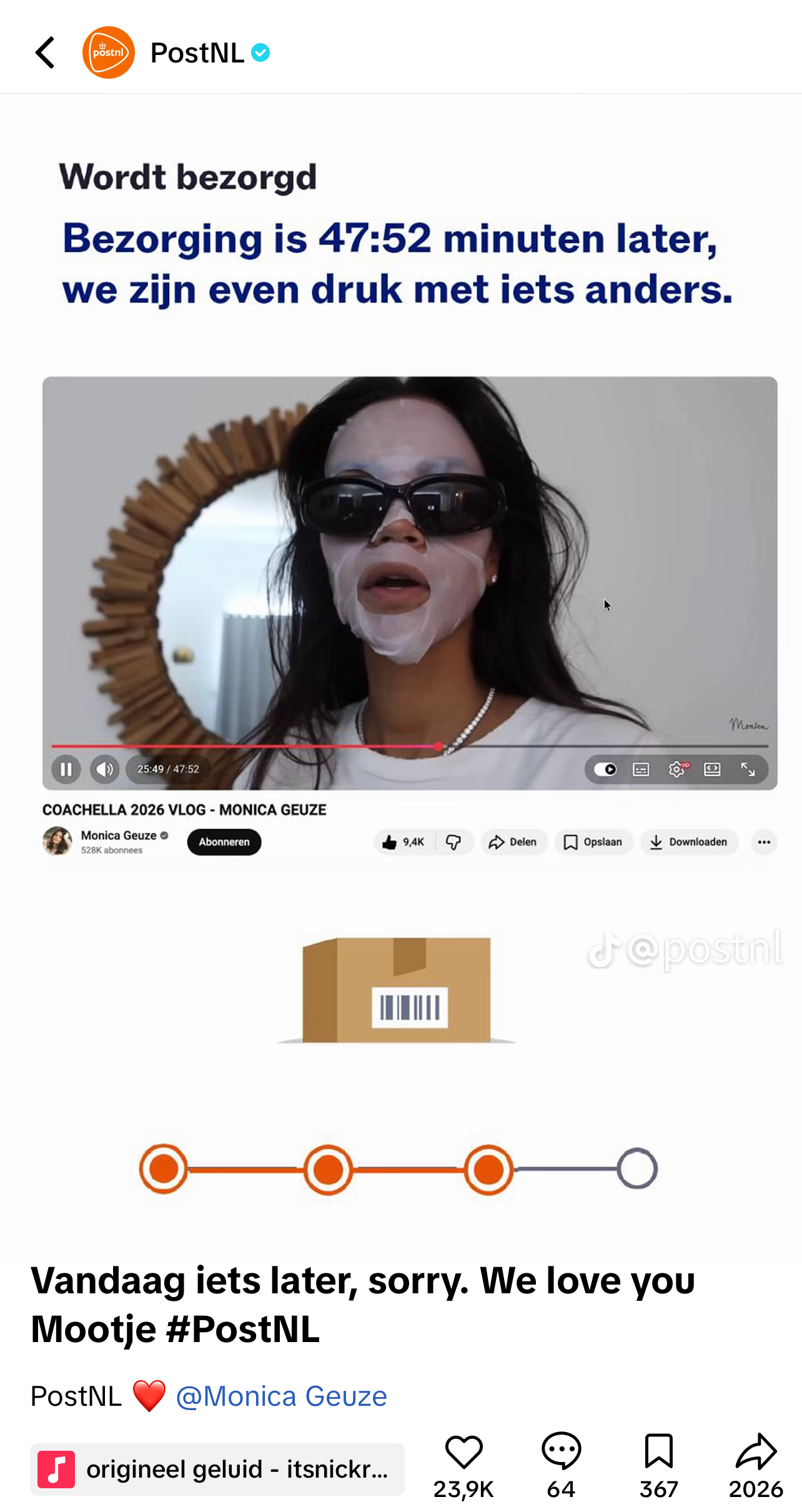 Vandaag is het officieel de laatste dag van Coachella. Dat is maar beter ook, want als je nog langer naar extravagante outfits en video’s van Sabrina Carpenter moest kijken, was de FOMO je waarschijnlijk te veel geworden. Je bent in ieder geval niet de enige die er last van heeft, want bij PostNL verloopt alles door Coachella ook iets stroever. Daar lopen ze namelijk om een bijzondere reden vertraging op en leggen het haarfijn uit op TikTok.