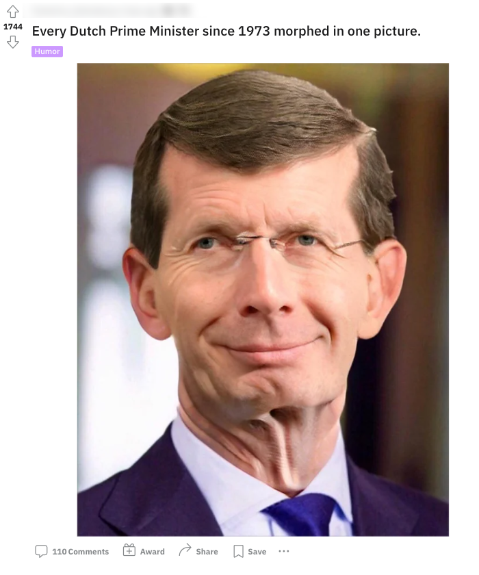 Je ziet soms de gekste dingen op Reddit voorbij komen: van hilarische observaties tot traumatisch nachtmerrie-materiaal. Wat deze Redditor heeft gemaakt zit daar precies tussenin: hij voegde de gezichten van alle Nederlandse premiers sinds 1973 samen tot één persoon, en eerlijk gezegd weten we niet precies hoe we ons erbij moeten voelen…