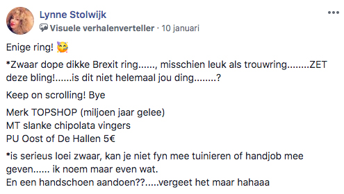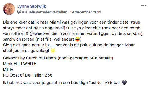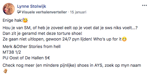 In de Facebookgroep Amsterdam Yard Sale verkopen Amsterdammers – net als op Marktplaats – hun hebben en houden. Wie een beetje z’n best doet op een leuke omschrijving, wordt bekroond tot ‘Visuele Verhalenverteller’. Een van de mensen die die titel dubbel en dwars verdiend, is Lynne.