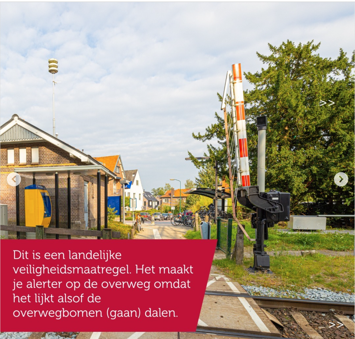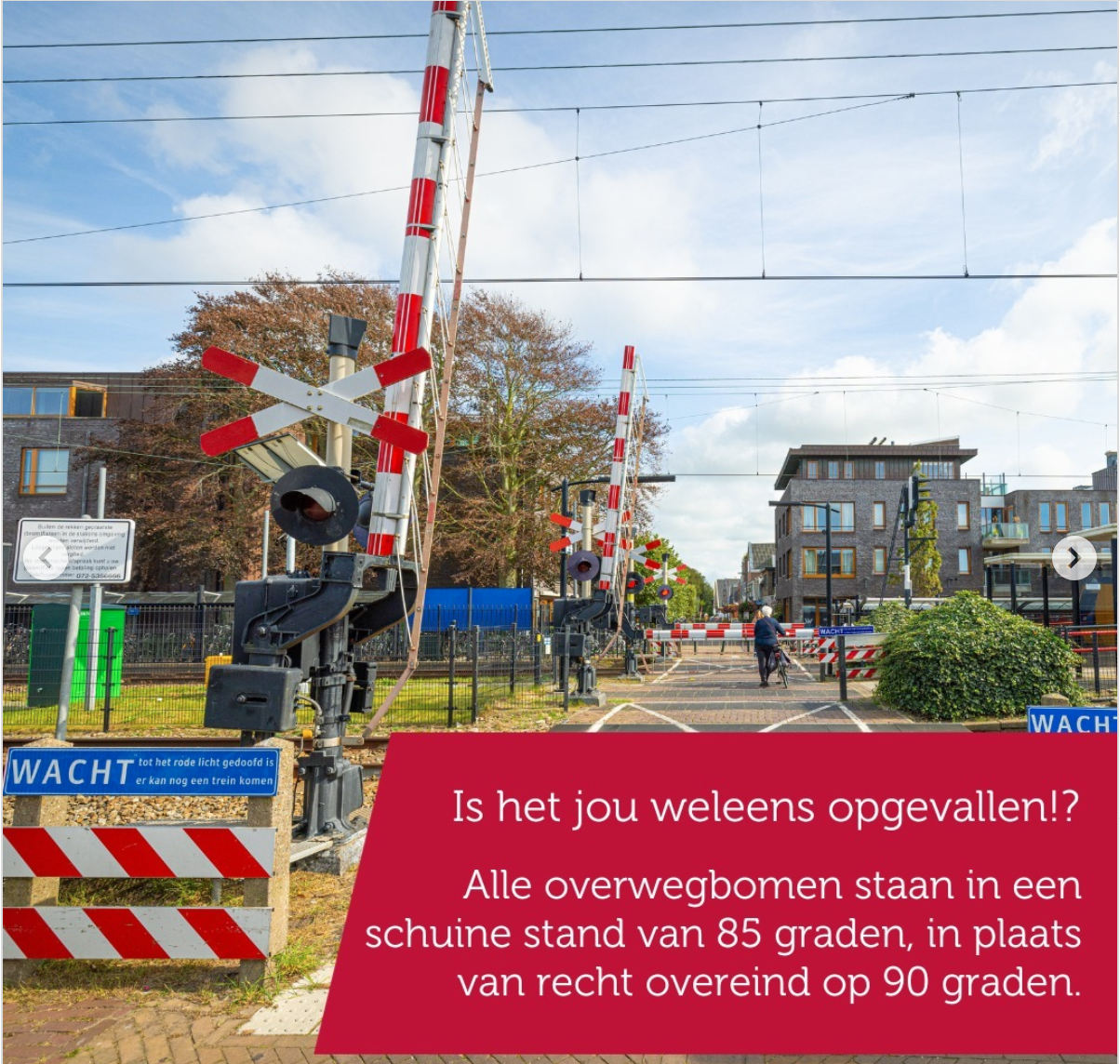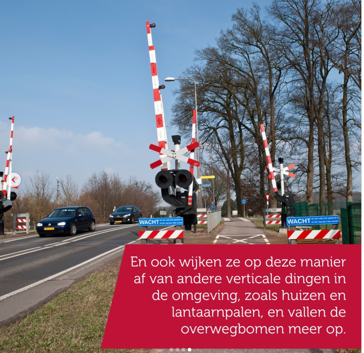 4. Mochten het alarm, de rode en witte kleuren en de ‘wacht’-borden niet genoeg zijn, dan is de scheve stand van de overwegbomen dus ook nog een waarschuwing.
