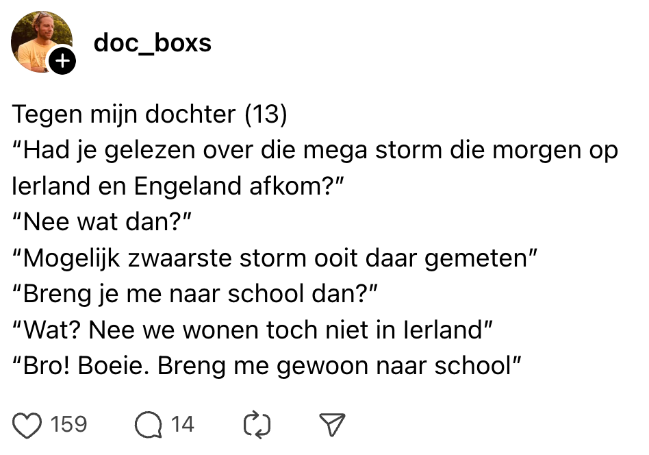 1. Met pubers weet je nooit wanneer je de wind van voren krijgt – en uit Ierland en Engeland.