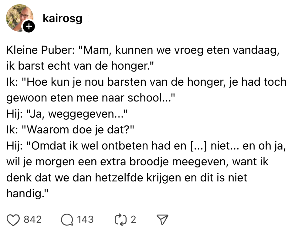 “Weet ik niet, die is al een half uur weg. Ik kom er zo aan.”Co-ouderschap met pubers, mensen. Home is where je kunt vreten.