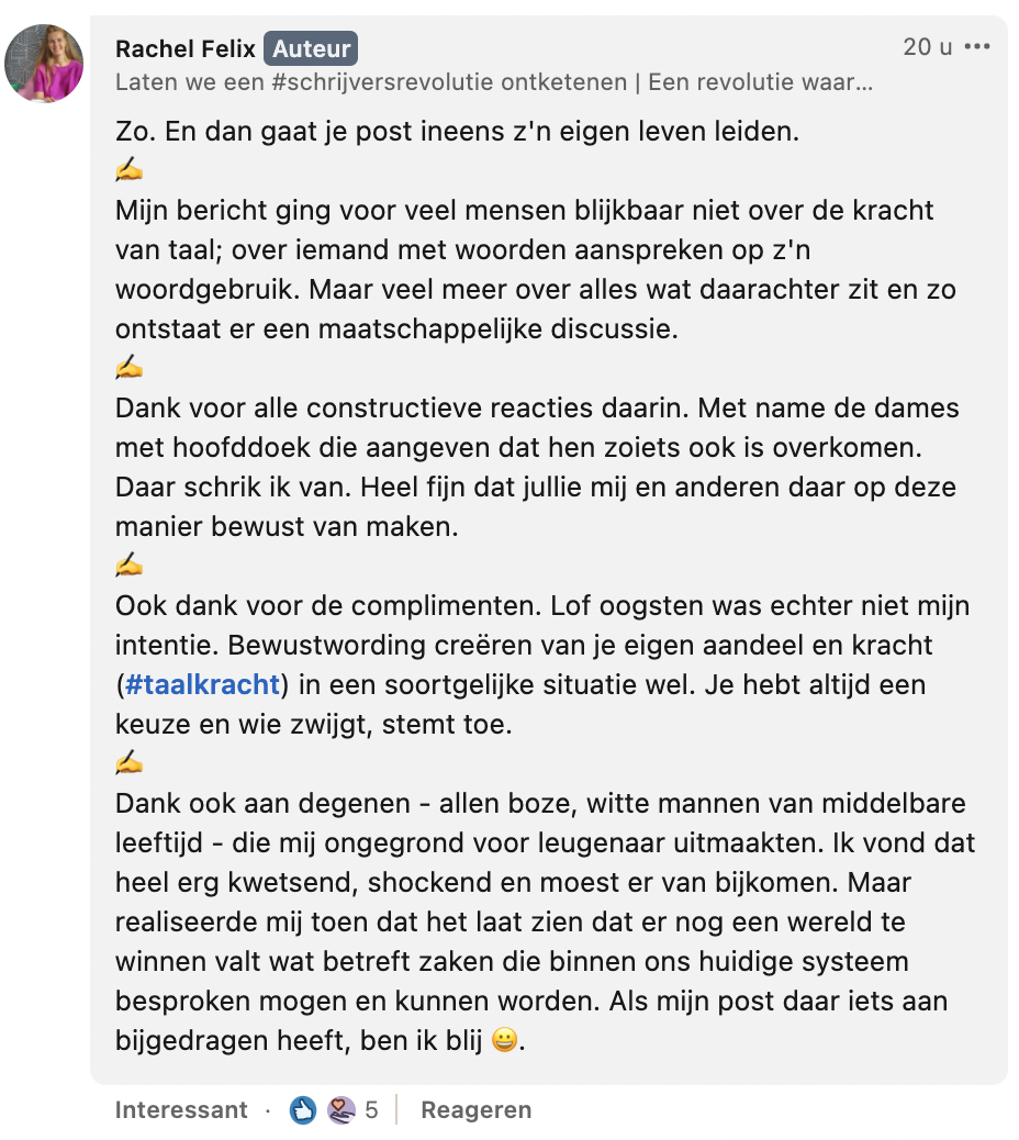 10. Rachel voegt later nog een extra uitleg aan haar post toe, waarmee ze enkele vragen en valse beschuldigingen de wereld uit helpt.