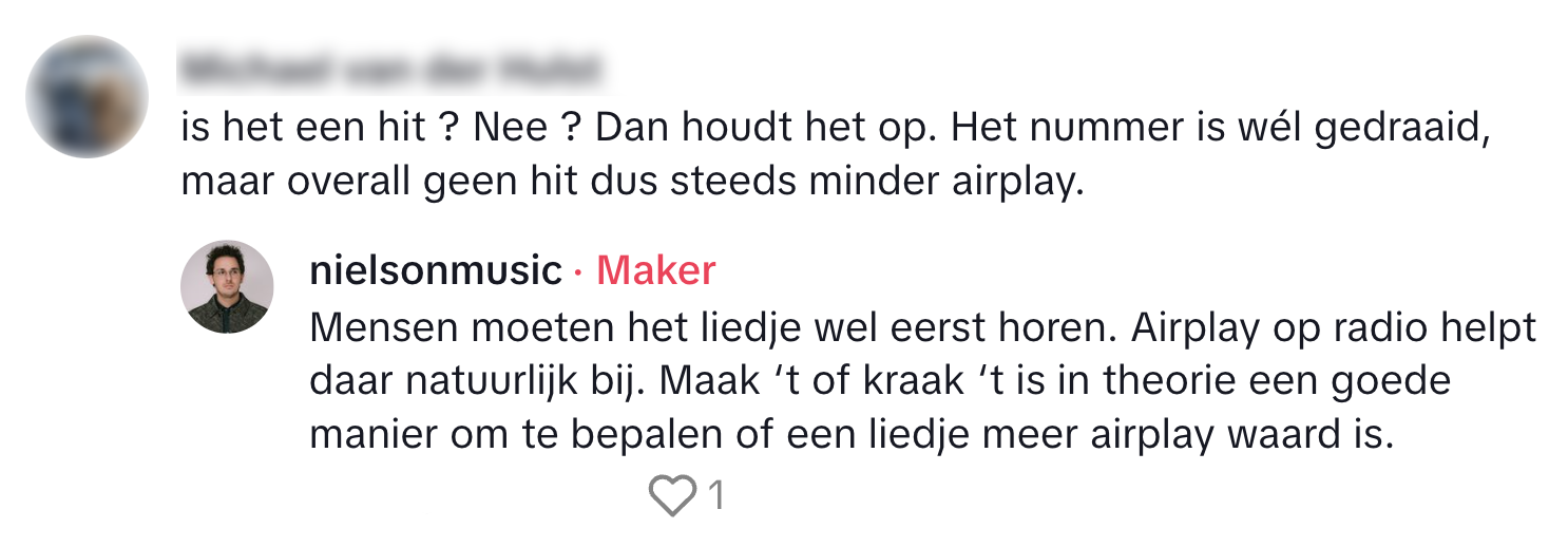 Als je naar de radio luistert, kun je meestal niet zelf bepalen welke nummers worden gedraaid. Radio 538 heeft echter een rubriek waarin luisteraars kunnen aangeven of ze een lied vaker willen horen of liever niet meer. Oftewel: zij kunnen een nummer maken of kraken. Het nieuwste lied van Nielson werd ‘gemaakt’, en daar was hij blij mee. Maar die blijdschap was van korte duur, want volgens hem is het nooit meer gedraaid door de desbetreffende radiozender. De artiest uit kritiek op de rubriek op Threads, en krijgt kort daarna een bericht van 538.