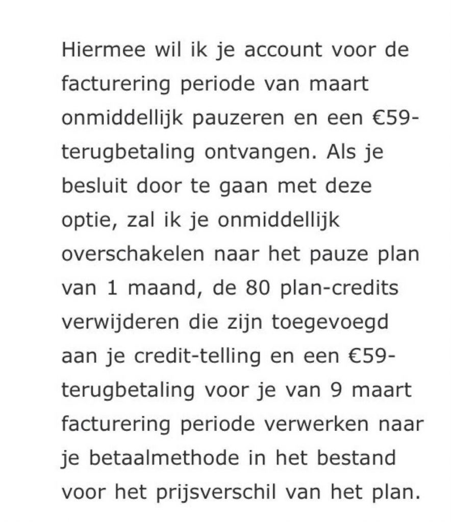 Je abonnement gaat op pauze. Je krijgt 59 euro terug maar je bent het creditplan met 80 punten kwijt (wat dat dan ook mag zijn). En of je even wil laten weten of je akkoord gaat.