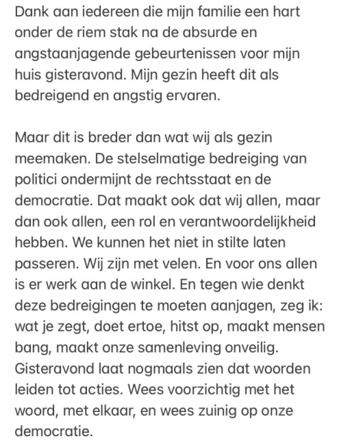 3. Kaag dankt alle mensen die haar en haar familie hebben gesteund. Daarnaast benadrukt ze dat bepaalde woorden of het opjutten van mensen daadwerkelijk kan leiden tot vervelende acties van individuen.