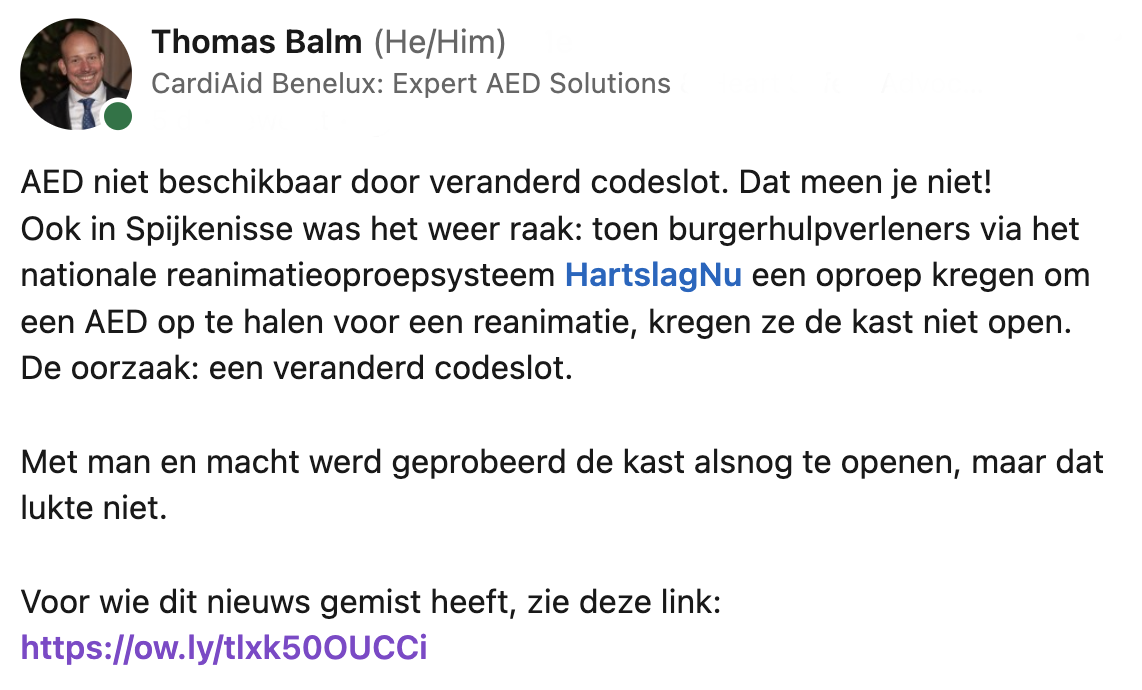 Wanneer iemand gereanimeerd moet worden, is het belangrijk om snel te handelen. Het klinkt dan ook logisch dat je een AED binnen no time moet kunnen gebruiken. Toch is dat niet altijd het geval, want op sommige zit een (code)slot. Aangezien zo’n slot het pakken van een AED in een hele puzzel kan veranderen – en dat precies is wat je níét wil in een noodsituatie – doet AED-expert Thomas een belangrijke oproep.