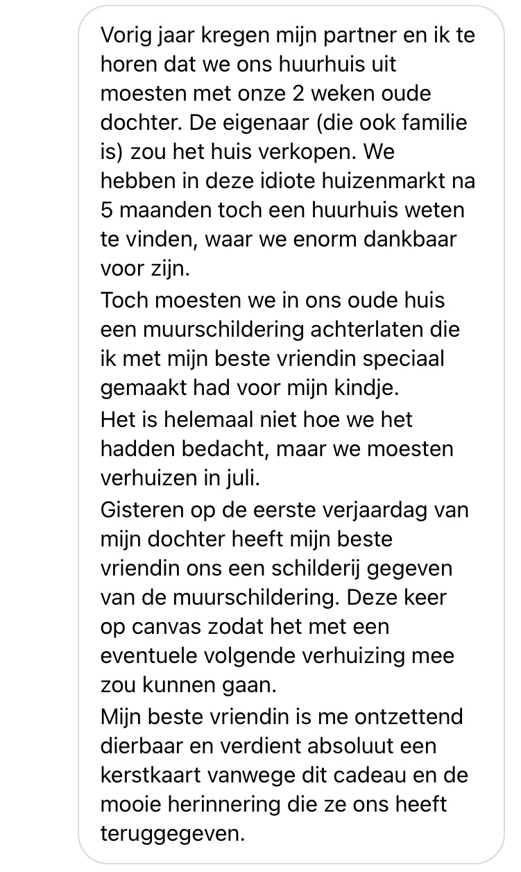 Bij een knusse kerst horen ook persoonlijke kerstkaarten aan familieleden, vrienden of buren. Om ze even te laten weten dat je aan ze denkt, bijvoorbeeld. En omdat kerst vol met kleine geluksmomenten zit, vroegen wij wie en waarom er van jullie een kerstkaart verdient. Jullie stuurden ons verhalen met redenen om iemand een kaart te sturen, en die zijn om over naar huis te schrijven.