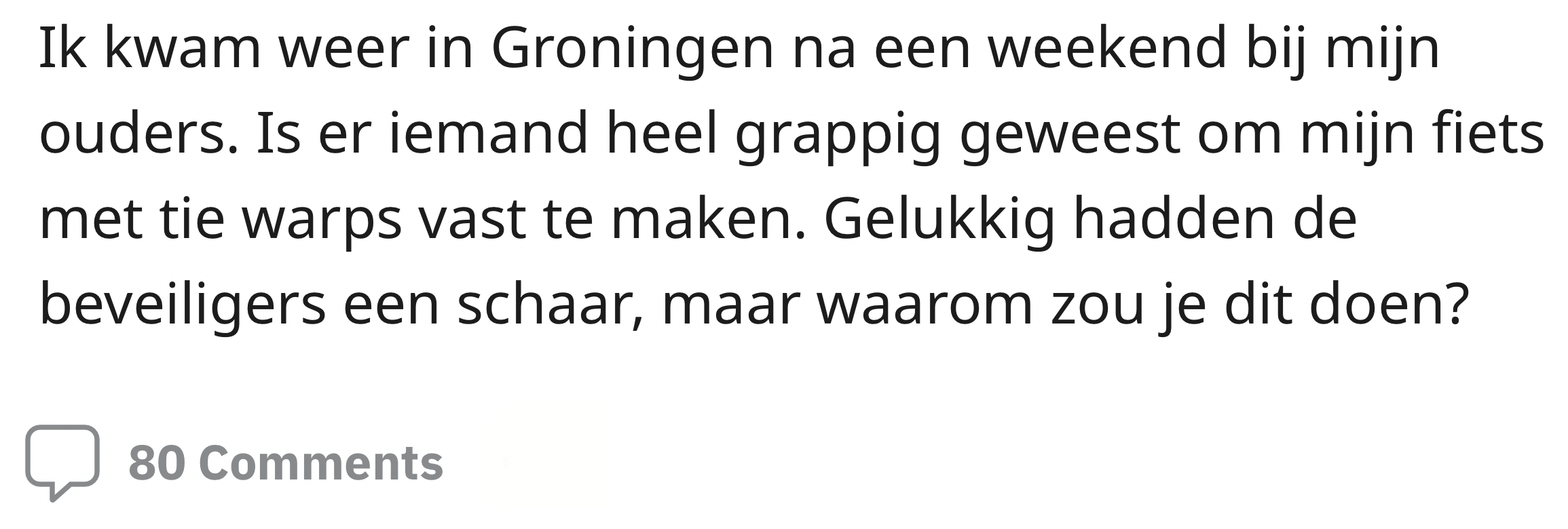 Thuiskomen in je eigen stad voelt voor veel reizigers als een warm bad. Lekker uit het treinraampje staren met de zon op je gezicht, terwijl de kerktoren je toelacht als je het station binnenrijdt. Dan vergeet je dat krijsende kind en die luid bellende aso tegenover je voor héél even. Deze Reddit-gebruiker komt na een lange treinrit weer aan in Groningen, maar is toch even wat minder blij met hoe diens fiets erbij staat op het station. Iemand blijkt namelijk een ‘hilarische’ grap uitgehaald te hebben.