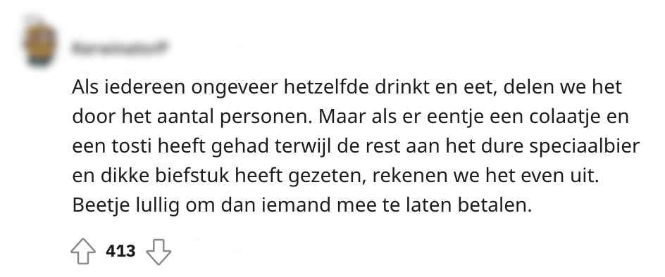 2. Volgens sommigen hangt de verdeling af van wat iedereen heeft gegeten en gedronken.