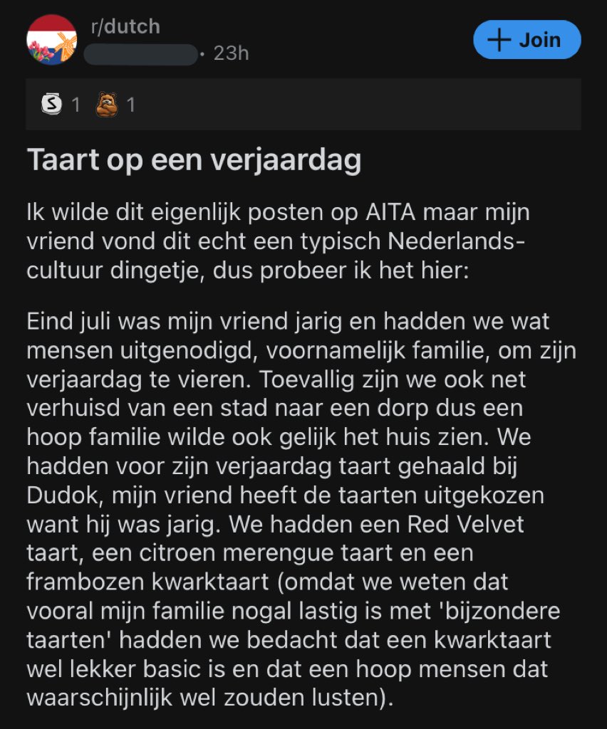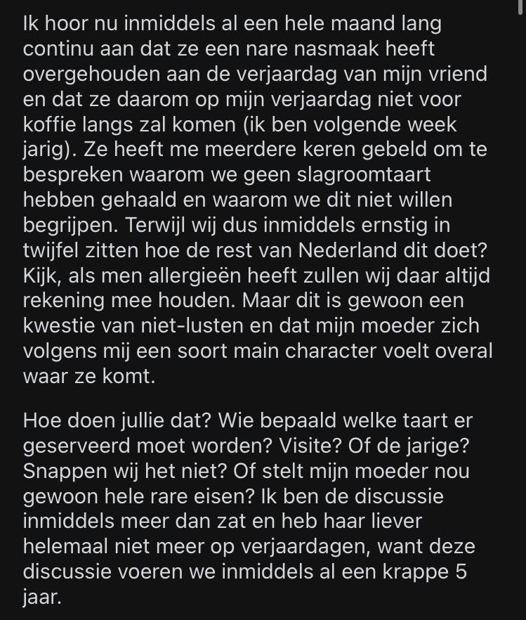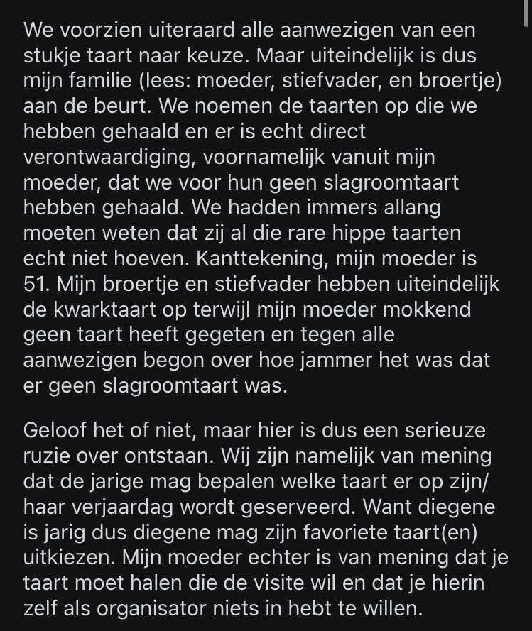 Ik ga naar een verjaardag en ik neem mee: een goed humeur, een cadeautje én een superkritische houding tegenover de taart die er geserveerd wordt. Dat dacht de moeder van een meisje op Reddit. Zij viel uit tegen haar dochter over diens taartkeuze en wil sindsdien niet meer op verjaardag komen. Het meisje deelt de slagroomtaartrel in een Reddit-bericht en het internet smult ervan.