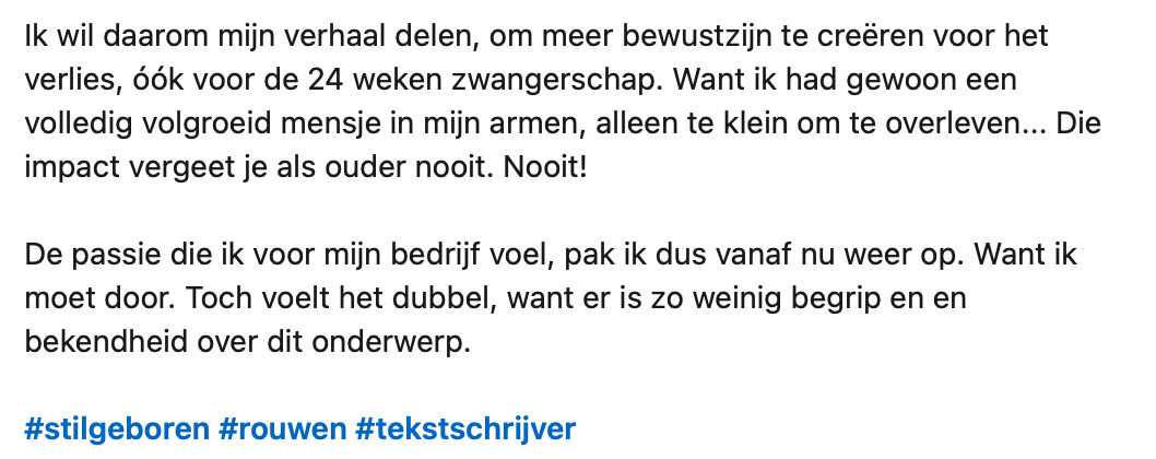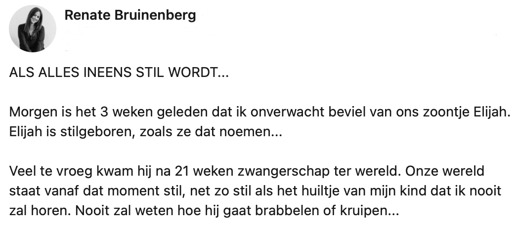 Renate Bruinenberg deelt een enorm persoonlijk verhaal op LinkedIn. Enkele weken geleden werd plots haar zoon Elijah geboren, alleen was dit veel te vroeg. Ze omschrijft hoe haar wereld vanaf dat moment heeft stilgestaan. Toch heeft ze het gevoel dat ze door moet. Niet omdat ze dit per se zelf wil, maar omdat de maatschappij dat van haar verlangt. Met haar bericht wil ze bewustzijn creëren, dat ook moeders van stilgeboren baby’s rust nodig hebben, zodat ze het verlies kunnen verwerken en hun lichaam kan herstellen.