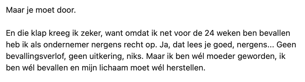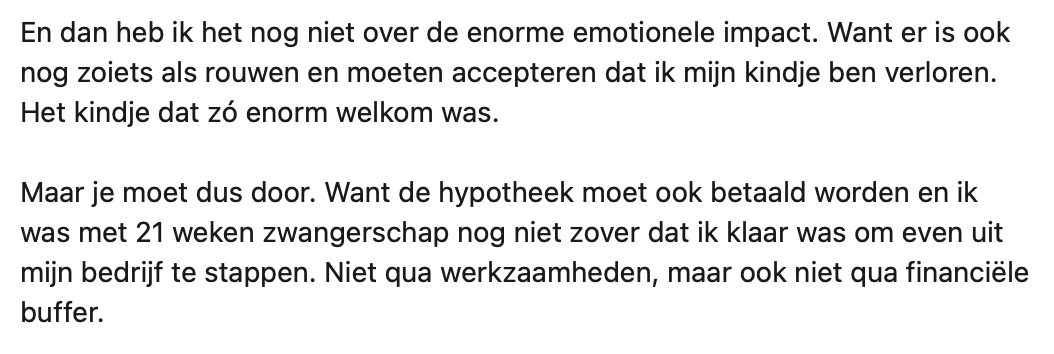 2. Omdat ze voor de 24ste week is bevallen, is er geen maatschappelijk vangnet. Hierdoor heeft ze het idee dat ze door moet en dat ze niet op haar eigen tempo kan rouwen en herstellen.