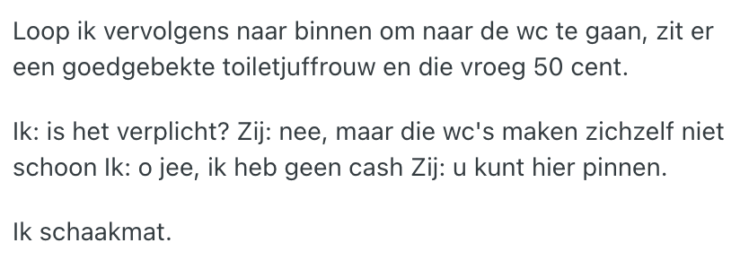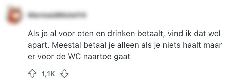 Als de zon ein-de-lijk een keer schijnt, willen wij Nederlanders dat direct vieren. Dus hup, het terras op. Frisje één, biertje twee, wijntje drie… Ah joh, als we toch bezig zijn, doe dan maar nog rondje. Op een gegeven moment kan je blaas het niet meer volhouden en ben je genoodzaakt het toilet op te zoeken. Wanneer een bezoeker van een beachclub na het betalen van de (forse) rekening bij de ingang van de wc’s aankomt, heeft een toiletjuffrouw een mededeling die volgens veel mensen op Reddit de pot op kan.
