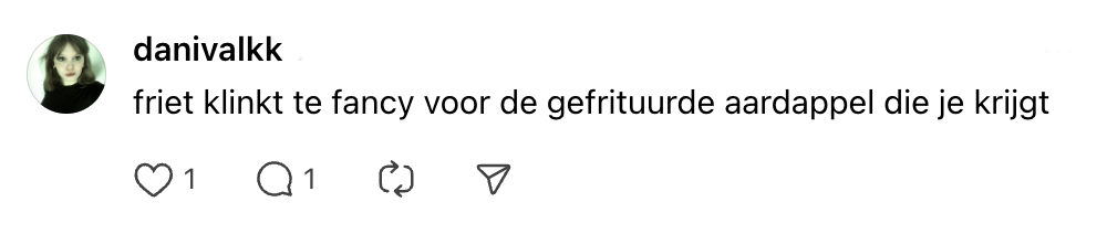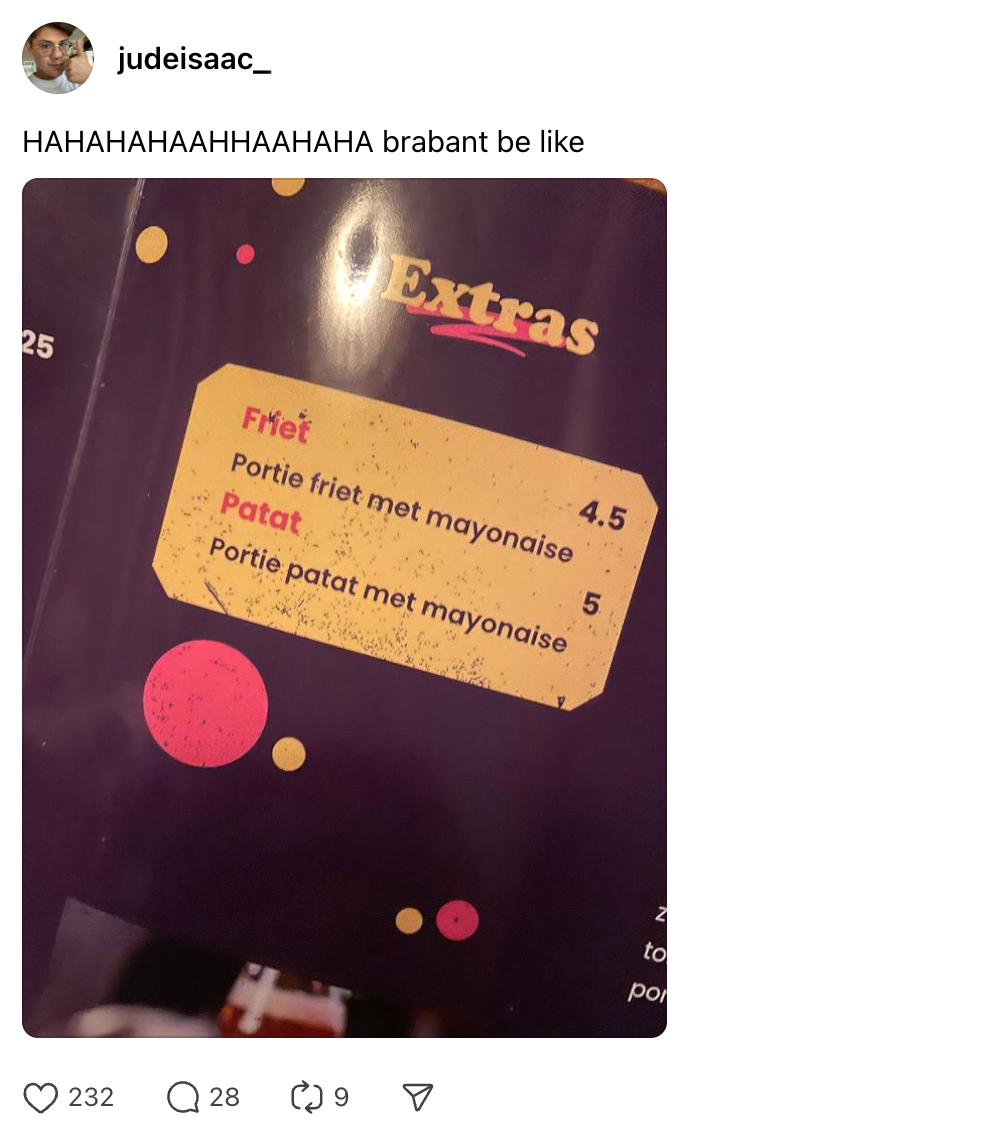 Het lijkt alsof de patat-friet-discussie al woedt sinds de uitvinding van het frituren. Zelfs na meerdere sterke argumenten van beide kanten en een heel onderzoek naar de grens, lijkt er geen einde te komen aan dit akkefrietje. Aan de menukaart te zien heeft dít restaurant in Brabant in ieder geval een duidelijke voorkeur. En daardoor beginnen veel Threads-gebruikers meteen te pieper- uh… piepen.