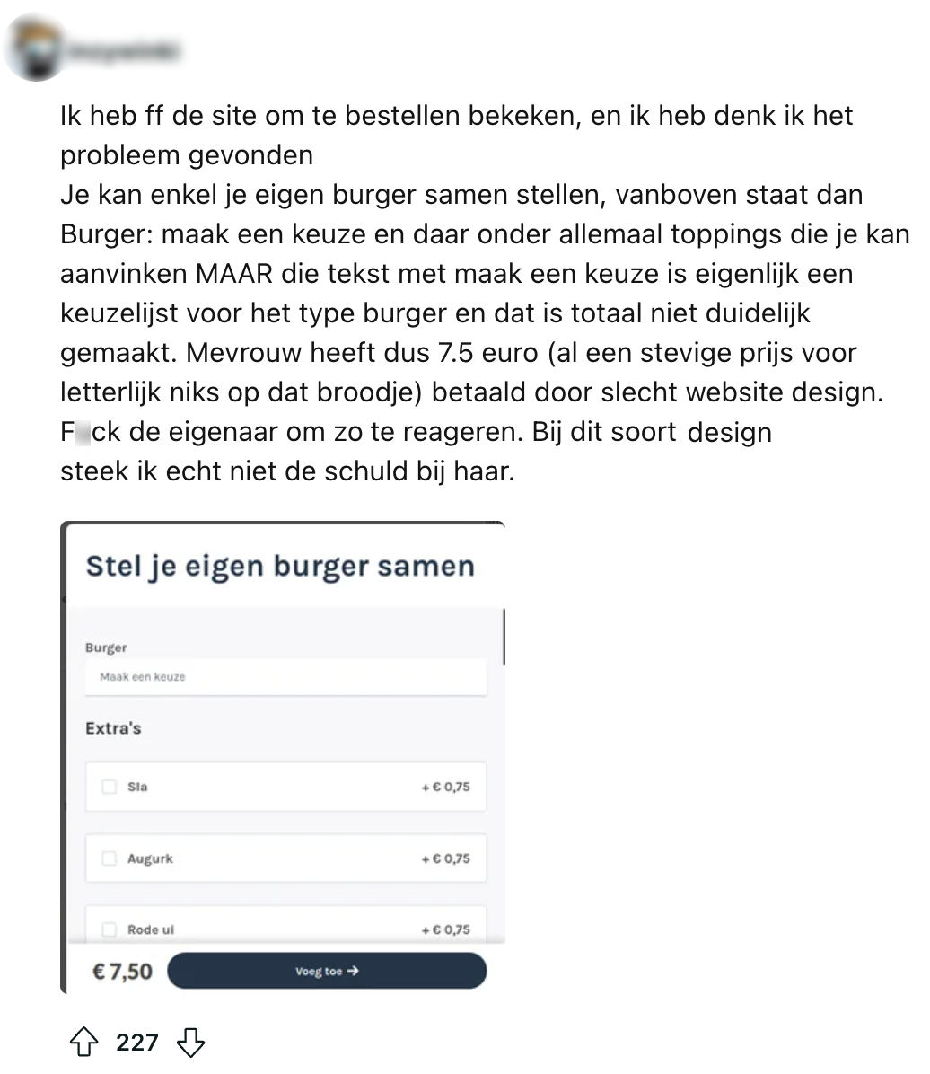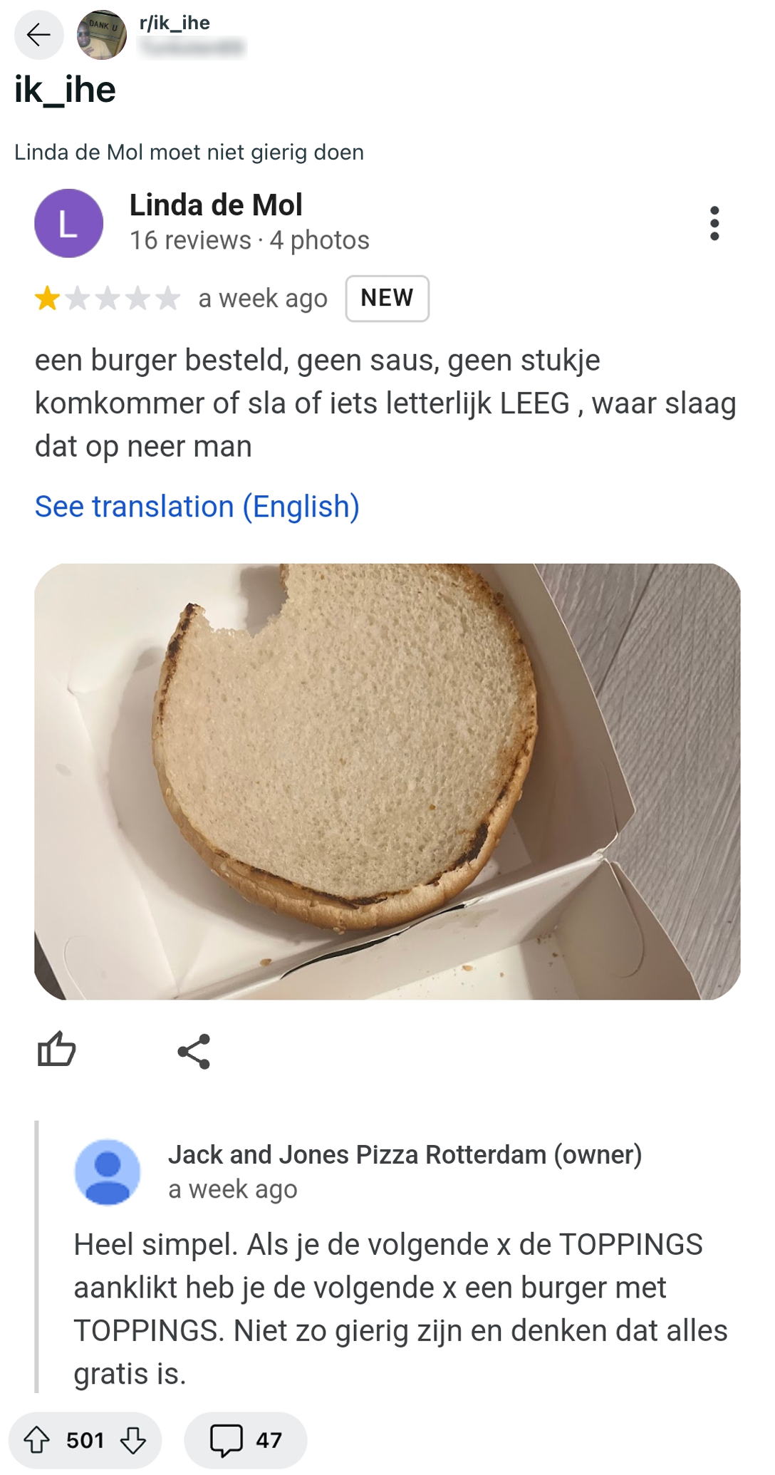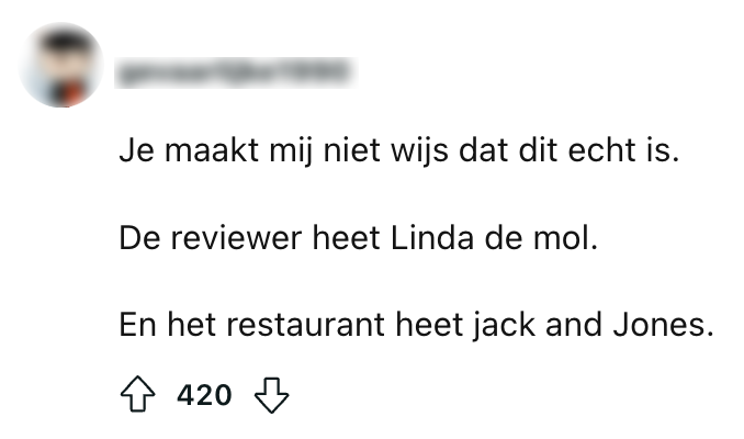 Potentiële klanten hechten veel waarde aan de meningen van anderen. De Google-review-sectie is dan ook de ideale plek om effe grondig onderzoek te doen naar het restaurant, de nagelstyliste of de kapper die je overweegt te bezoeken. Omdat de meeste eigenaren weten hoe belangrijk het is om goed contant met klanten te onderhouden, reageren zij vaak op de achtergelaten reviews. Dat doet de eigenaar van dít restaurant ook. Al lijkt-ie het niet zo nauw te nemen met de mening van z’n klanten.