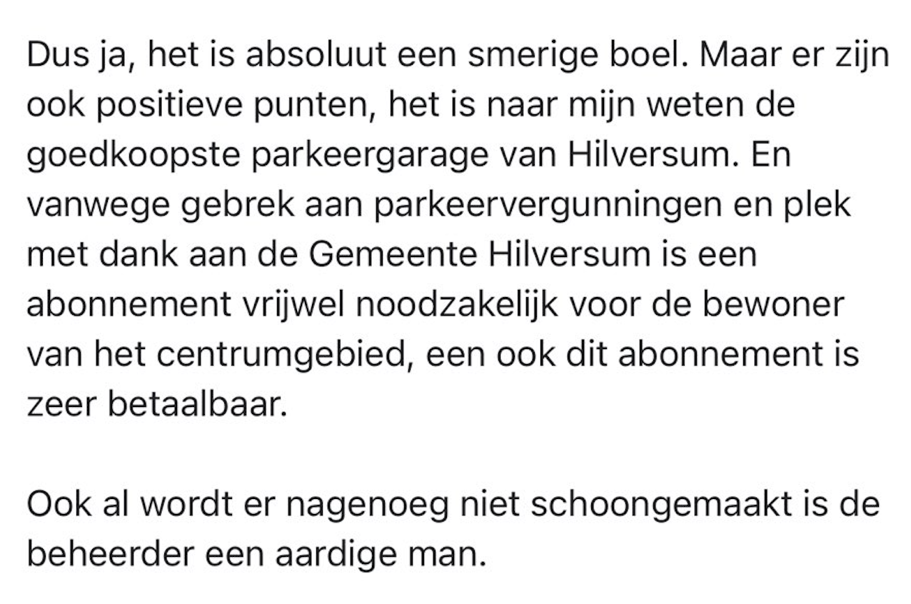 Zo nu en dan kom je op een plek terecht die zó smerig, vreselijk of hinderlijk is dat je bij thuiskomst echt effe je hart moet luchten. En wat is daar een betere plek voor dan Google Maps? Thijn liet daar een review achter na een bijzondere ervaring in een parkeergarage, maar dat maakte zijn dag uiteindelijk alleen nog maar slechter. Gelukkig kan hij met zijn recensie wél een hoop mensen op Twitter vermaken.