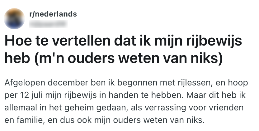Voordat je je rijbewijs in handen hebt, moet je eerst heel wat rijlessen doorstaan, je theorie-examen halen, wellicht een tussentijdse toets afleggen en misschien wel het ergste: je rijexamen overleven zonder mental breakdown en al te veel ingrepen. Kortom: een stressvolle periode. Sommige toekomstige automobilisten vertellen hun omgeving daarom niet dat ze wekelijks een paar uur naast een rij-instructeur in de auto vertoeven. Déze leerling hoopt binnenkort in het geheim te slagen voor het rijexamen en zoekt nu naar de meest spectaculaire manier om dit te onthullen. En daar kan Reddit wel bij helpen.