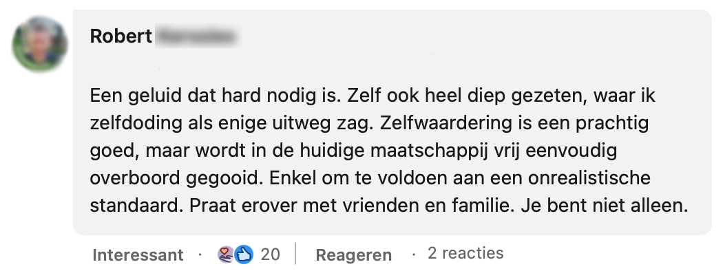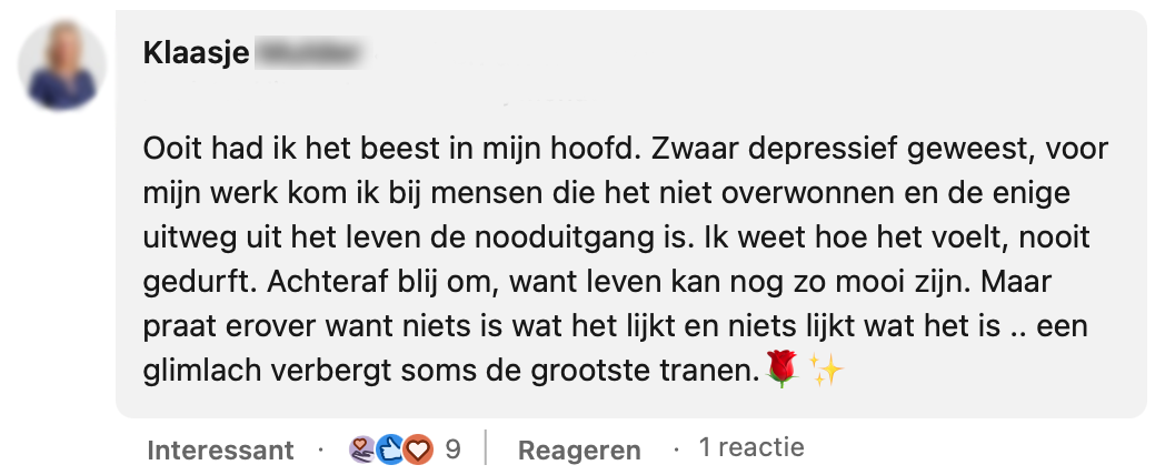 Heb jij wel eens gedachten over het beëindigen van je leven?  Dan kun je anoniem contact opnemen met Stichting 113 via 0800-0113 (gratis) of chat op 113.nl.