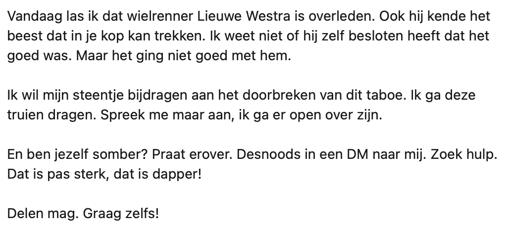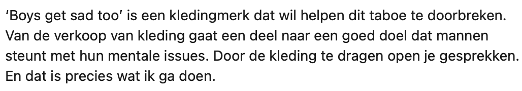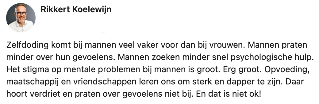 Trigger warning: dit artikel gaat over een einde aan je leven maken. Soms zitten mensen zo erg met zichzelf in de knoop dat ze geen uitweg meer zien. Daarom is het extra belangrijk om over je gevoelens en emoties te praten. Rikkert vindt dat mannen dit nog veel te weinig doen en dat dit een van de redenen is waarom mannen vaker een einde aan hun leven maken dan vrouwen. Zelf heeft hij ook geworsteld met bijvoorbeeld depressies, en daarom wil hij zich inzetten voor het bijzondere kledingmerk ‘Boys get sad too‘.