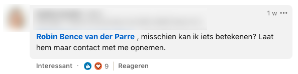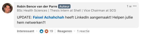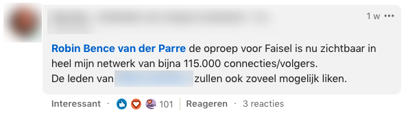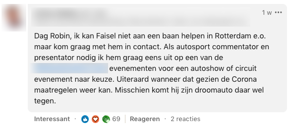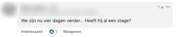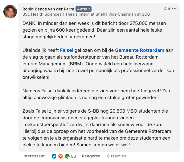 1. Dit is het bericht dat Robin op LinkedIn plaatste. Faisel is op zoek naar een stage en Robin besluit om hem daarmee te helpen.