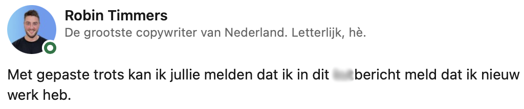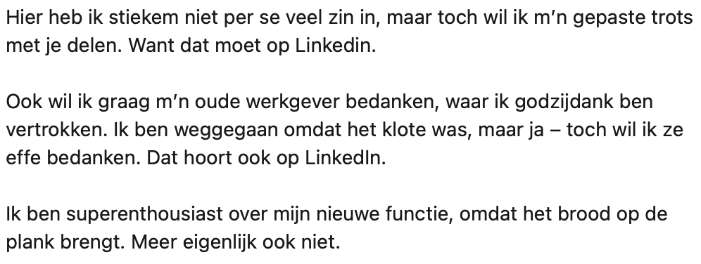 Robin is copywriter en dan mag je verwachten dat iemand handig is met woorden. Dat besloot hij eens te bewijzen in een bericht dat hij op LinkedIn plaatste. Veel mensen gedragen zich namelijk wat zakelijker op LinkedIn, maar Robin vond de berichten die hij langs zag komen toch echt iets te cliché worden. Hij heeft het standaard LinkedIn bericht eens op de schop genomen en er een eerlijke versie over geschreven.