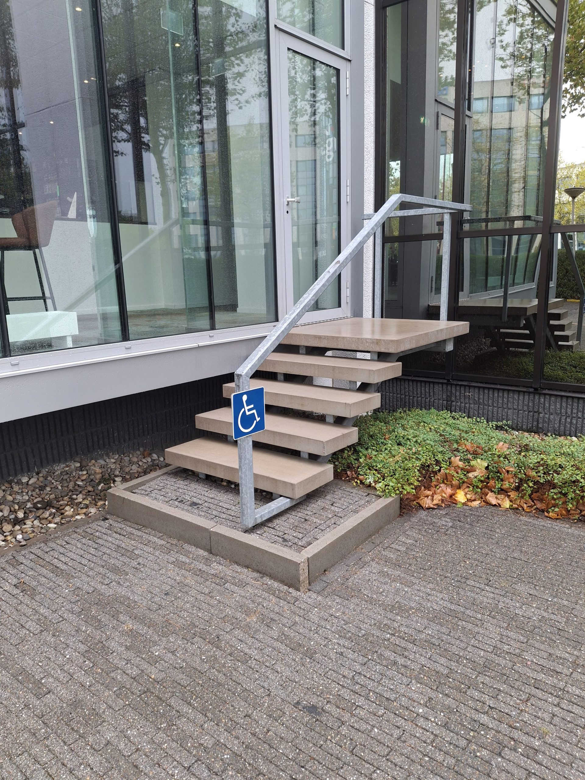 Als je het geluk hebt dat je op twee benen kunt lopen, kom je ongeschonden door de hindernisbaan aan trappen, stoepjes, speelgoed van kinderen en huisdieren heen. Als je in een rolstoel zit of met een rollator loopt, gaat dat vaak een stuk minder makkelijk. Het zou daarom eigenlijk standaard moeten zijn dat de ingang van een bedrijf voor iedereen eenvoudig te bereiken is. Dit bedrijf gooit het echter over een andere boeg en laat rolstoelgebruikers flink zweten door dit bord op een opvallende plek te hangen.