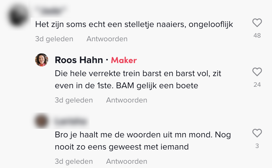 Nadat Roos in een overvolle trein besloot om in de eerste klas te gaan zitten, leverde dat haar een boete op. Toch is Roos de moeilijkste niet: ze betaalde ‘m namelijk netjes. Maar nadat ze haar boete betaald had, ontving ze óók nog een brief, waarin stond dat ze nog vijftien euro registratiekosten moest betalen. Daarmee is de maat vol voor Roos, en dus doet ze een boze oproep aan de NS via TikTok.