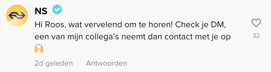 6. De video is NS niet ontgaan en dat laat het bedrijf weten via deze reactie. Het probleem is momenteel nog niet opgelost, maar Roos bekijkt het positief: “We gaan het zien. Het is pas maandag!”, vertelt ze aan ons.