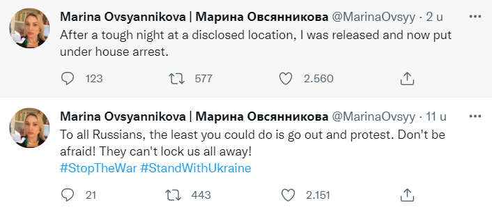 4. Ondanks dat de advocaat van Marina geen enkele vorm van contact wist te krijgen sinds haar protest, kwam er voor korte tijd een Twitteraccount online. Het account zou van Marina Ovsyannikova zijn waar ze haar situatie met de buitenwereld deelt. Maar…