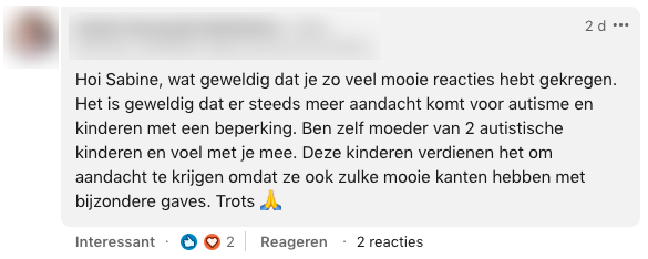 Nadat Sabine een bericht op LinkedIn plaatste over de moeilijke periode met haar zoon die autisme heeft, stroomden de reacties binnen. Van steunbetuigingen tot verhalen van mensen die zich volledig in haar woorden kunnen herkennen. En als kers op de taart werd Sabine verrast met een aardigheidje aan huis. Ze besluit er nog eens een bericht aan te wijden op LinkedIn en opnieuw regent het warmhartige reacties.