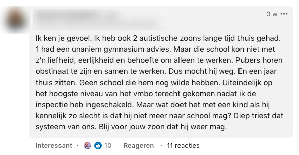 1. Dit is het bericht dat Sabine een tijdje geleden op LinkedIn plaatste over haar 14-jarige zoon, die autistisch is. Al van jongs af aan heeft hij het niet makkelijk op school.