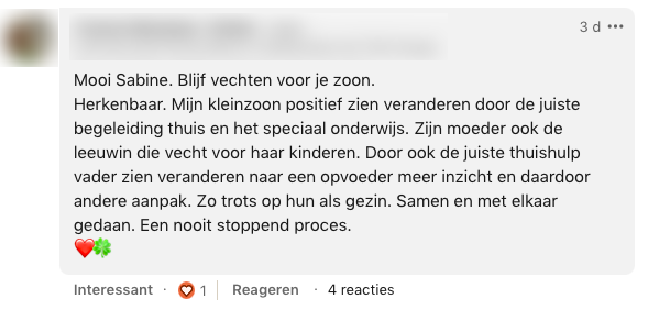Nadat Sabine een bericht op LinkedIn plaatste over de moeilijke periode met haar zoon die autisme heeft, stroomden de reacties binnen. Van steunbetuigingen tot verhalen van mensen die zich volledig in haar woorden kunnen herkennen. En als kers op de taart werd Sabine verrast met een aardigheidje aan huis. Ze besluit er nog eens een bericht aan te wijden op LinkedIn en opnieuw regent het warmhartige reacties.