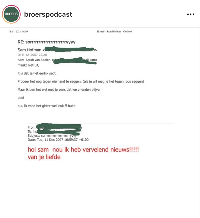 Sam en Rijk Hofman zijn de broertjes van Tim Hofman. Net zoals Tim, zitten ook zij in de media. Ze hebben namelijk hun eigen, succesvolle podcast ‘Broers’ waarin ze (dronken) verhalen vertellen aan elkaar en aan de luisteraar. Vaak gaan deze verhalen over uitgaan, bedpartners en exen. Een paar maanden terug vertelde Sam Hofman hier dat hij ooit in groep 3 verkering had met Sarah van Soelen – ex van Andre Hazes. Dat verhaal krijgt nu ineens een grappig vervolg.