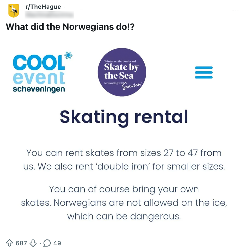 Normaal gesproken gelden er op de schaatsbaan niet veel regels. Een beetje opletten voor de andere bezoekers en kleuters niet (met opzet) omver duwen, en het zit wel snor. Maar sommige schaatsbanen hanteren wél een aantal strenge regels. Deze Reddit-gebruiker heeft namelijk een nogal bijzondere regel op de website van een schaatsbaan in Scheveningen ontdekt: ‘Norwegians’ zijn verboden. Een andere Nederlander legt haarfijn uit waarom.