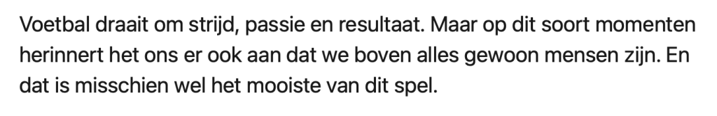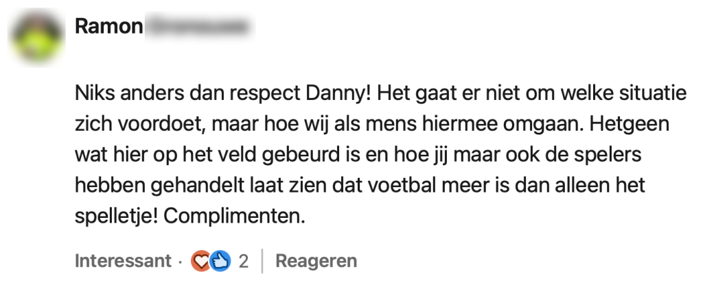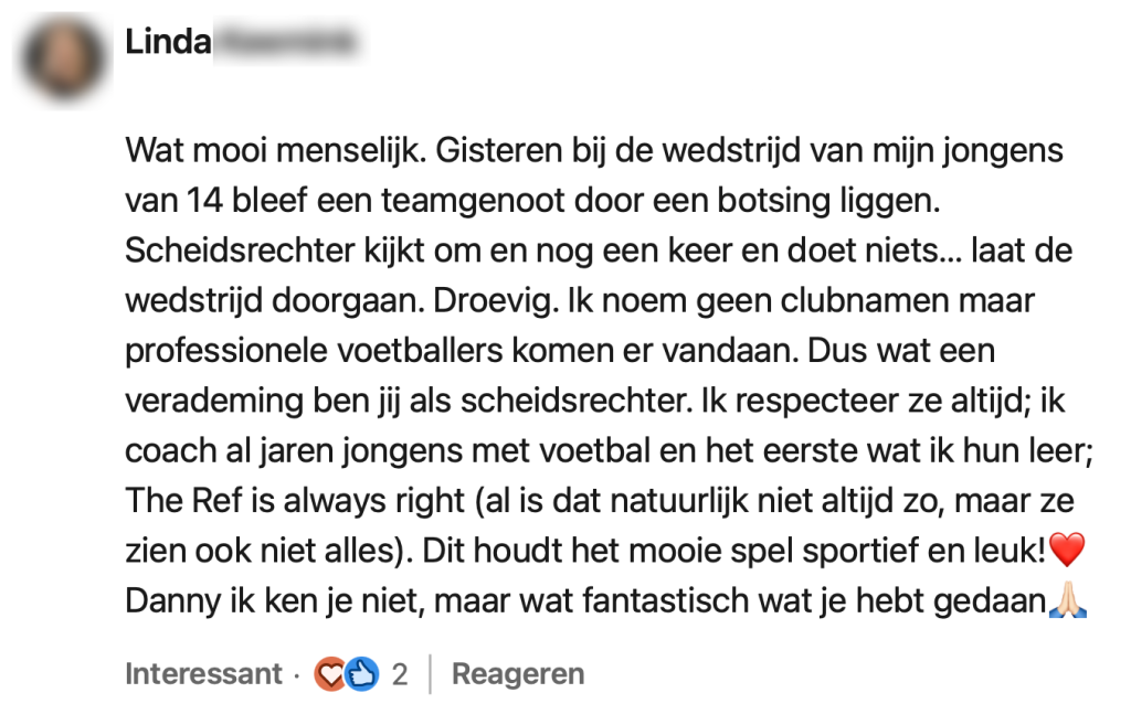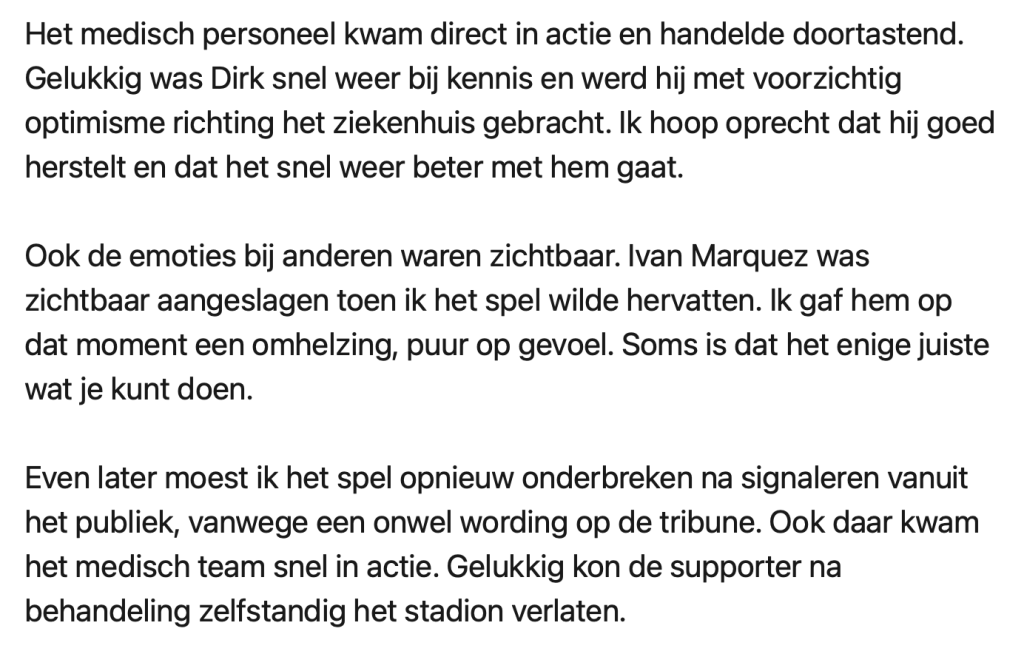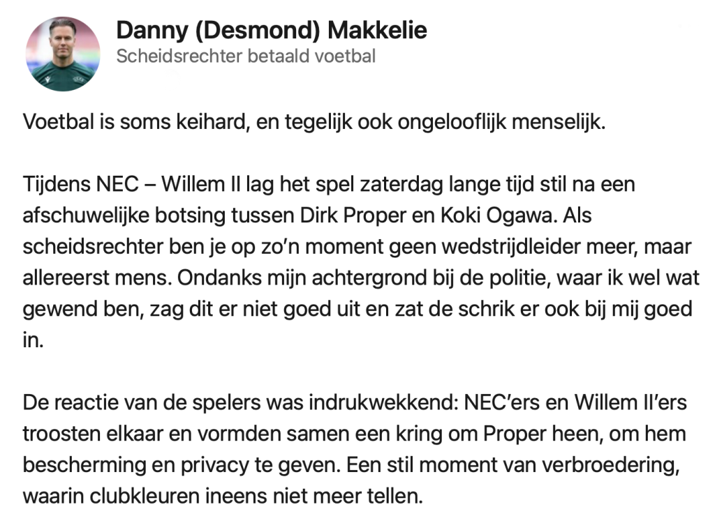 Afgelopen zaterdag kreeg N.E.C. Willem II op bezoek in Nijmegen, maar de wedstrijd verliep niet zoals de meeste duels. Nog voor de rust botsten N.E.C.-spelers Proper en Ogawa hard tegen elkaar, waarna Proper stil bleef liggen. Terwijl het medisch team zich over Proper ontfermde, vormden spelers van beide clubs een haag om hem heen – om publiek en camera’s het zicht te ontnemen. Spelers, trainers, arbitrage en toeschouwers waren zichtbaar aangeslagen en sommigen lieten de tranen de vrije loop. Nog geen vijf minuten later werd de wedstrijd opnieuw stilgelegd, toen iemand in het publiek onwel raakte. Scheidsrechter Danny Makkelie, die de wedstrijd floot, kreeg veel lof voor zijn handelen tijdens deze ingrijpende momenten. Hij deelt zijn openhartige verhaal op LinkedIn en roept op tot meer menselijkheid in het voetbal.