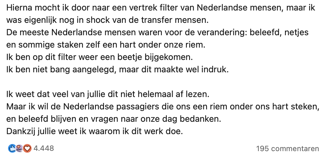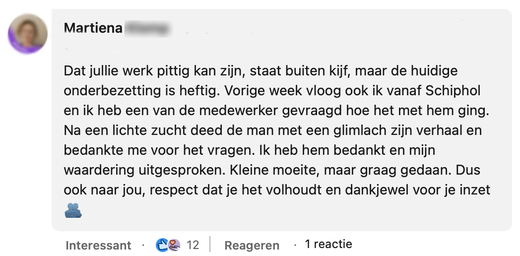 8. Als je de komende tijd nog via Schiphol vliegt, neem dan een voorbeeld aan Martiena en geef de medewerkers een extra glimlach of knoop een leuk gesprek met ze aan.
