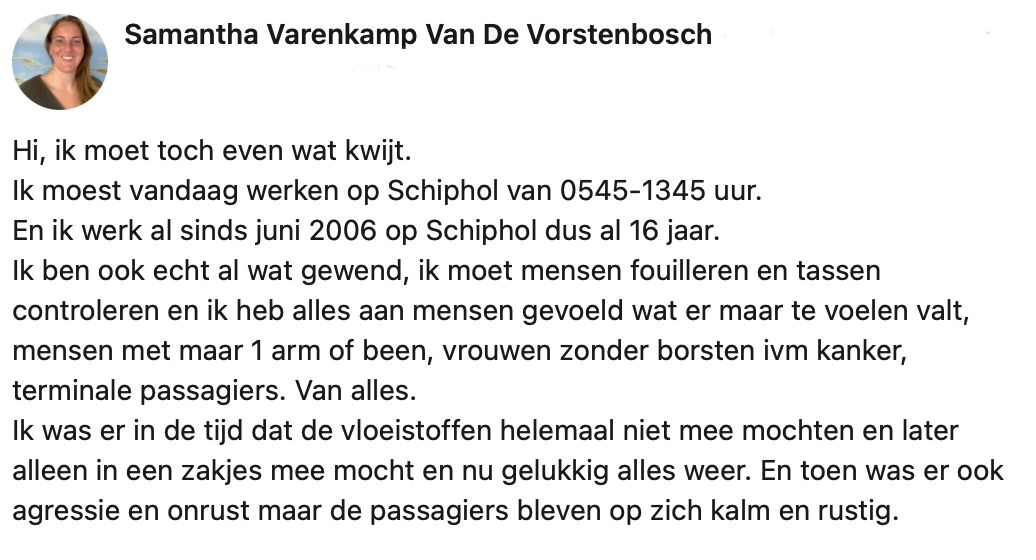 De rijen op Schiphol worden maar niet minder. Overal duiken video’s op van wachtende passagiers, maar misschien moeten we ook eens stil staan bij het personeel dat overuren draait. Samantha werkt al zestien jaar op Schiphol en is inmiddels heel wat gewend, maar ze besluit nu toch haar ervaringen van de afgelopen periode te delen.